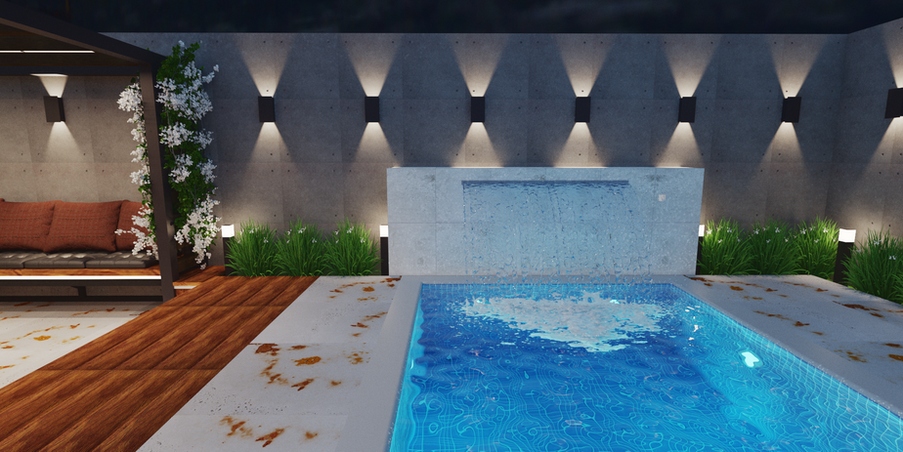 Um espaço externo contemporâneo que une lazer, sofisticação e natureza. A piscina e a cascata em revestimentos atérmicos são protagonistas, em harmonia com o deck em travertino e madeira. O pergolado em ferro preto, vidro e madeira recebe trepadeiras que trazem frescor e leveza, enquanto a parede 3D Trafitto adiciona textura e modernidade. Com mesa de sinuca, banco com almofadas e espreguiçadeiras, o ambiente valoriza convivência, conforto e elegância. A paleta de verdes, brancos, tons terrosos e preto cria equilíbrio entre modernidade, luxo e delicadeza natural.